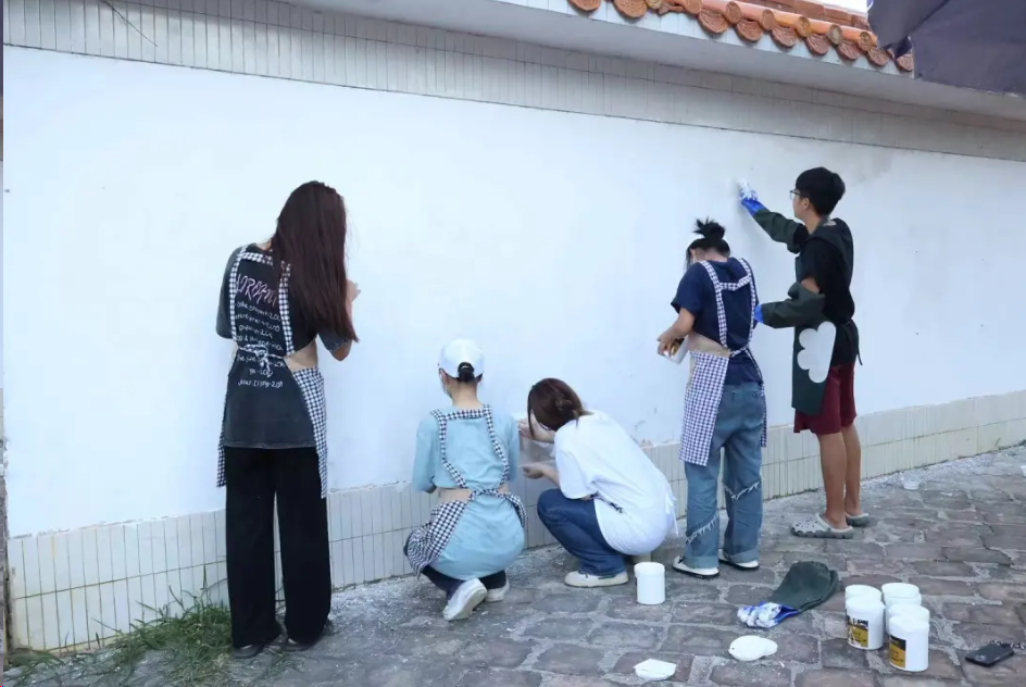 五天的時間,實踐隊員頂著高溫烈日完成高度為1.64米、長達7.85米的墻體彩繪,繪畫過程中使用了17種顏料進行繪畫創(chuàng)作,每一筆每一劃每一滴汗水都傾注著他們對美麗圩鎮(zhèn)的熱愛和對美的追求。