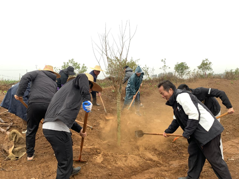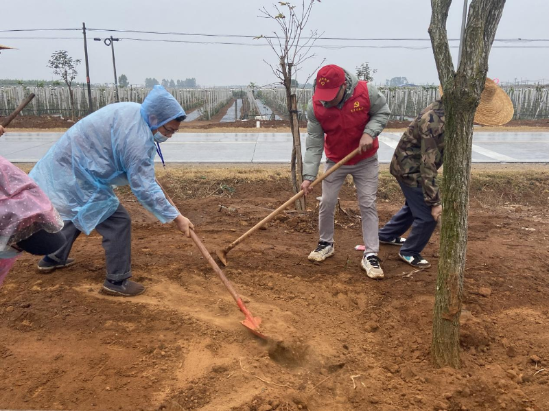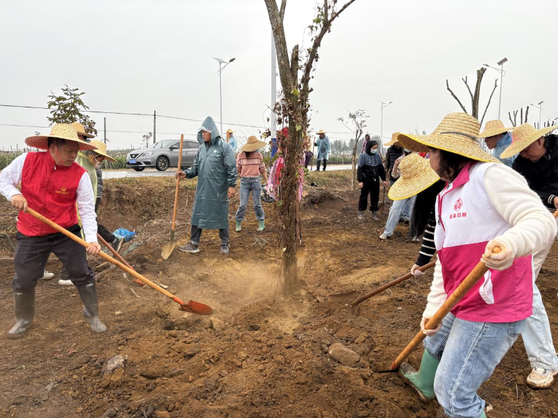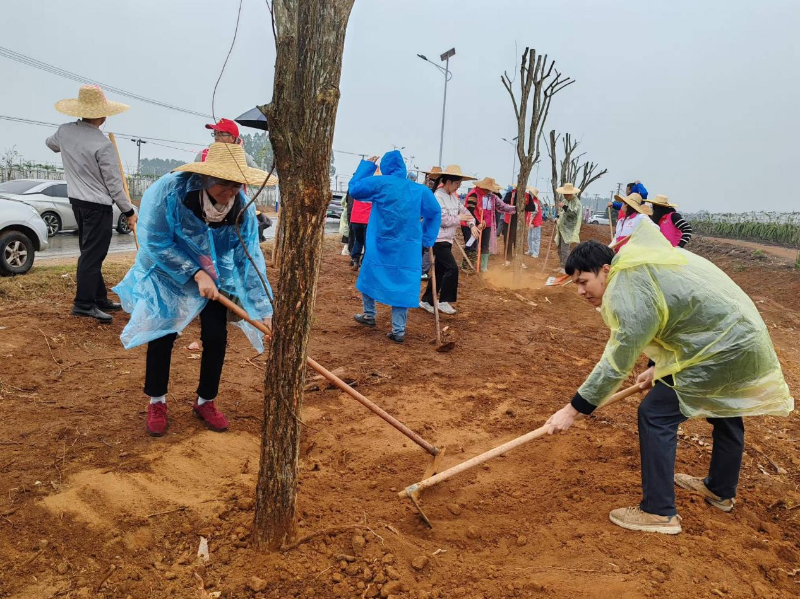 活動(dòng)現(xiàn)場,全體人員熱情高漲,干勁十足。盡管下起了細(xì)雨,但大家仍堅(jiān)持分工協(xié)作,三五成組,有條不紊地?fù)]鍬鏟土、扶苗填坑、澆水灌溉。雨水與汗水交織,更添一份齊心協(xié)力的干勁,現(xiàn)場氣氛熱烈而有序。