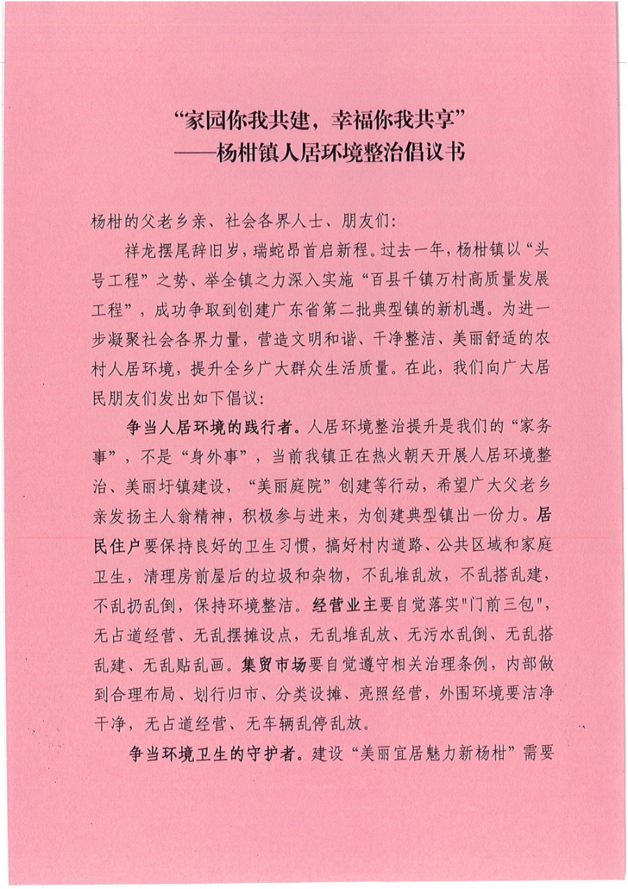 家園你我共建,幸福你我共享”——楊柑鎮(zhèn)人居環(huán)境整治倡議書