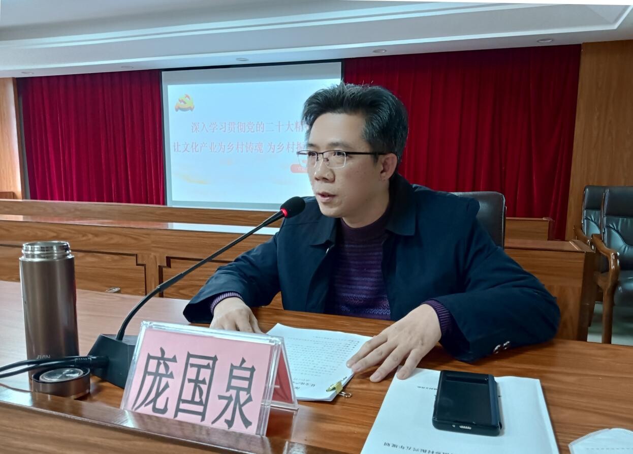 為深入學(xué)習(xí)貫徹黨的二十大精神,1月4日下午,由遂溪縣委宣傳部主辦,洋青鎮(zhèn)黨委、政府承辦的遂溪縣學(xué)習(xí)宣傳貫徹黨的二十大精神宣講活動(dòng)在洋青鎮(zhèn)舉行,市委講師團(tuán)副團(tuán)長(zhǎng)、洋青鎮(zhèn)黨委副書(shū)記、市鄉(xiāng)村振興駐洋青鎮(zhèn)工作隊(duì)隊(duì)長(zhǎng)龐國(guó)泉作了主題為《深入學(xué)習(xí)貫徹黨的二十大精神,讓文化產(chǎn)業(yè)為鄉(xiāng)村鑄魂