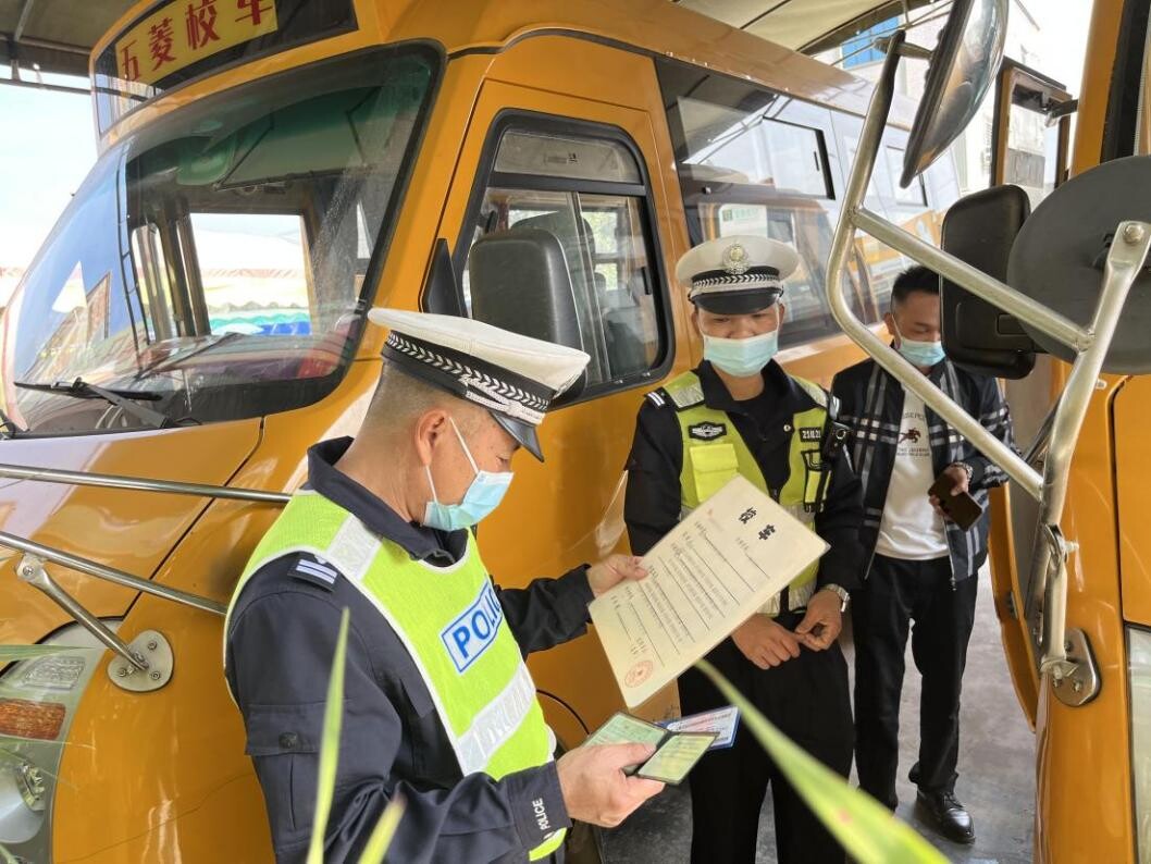 圖為交警中隊(duì)檢查校車駕駛?cè)讼嚓P(guān)證件