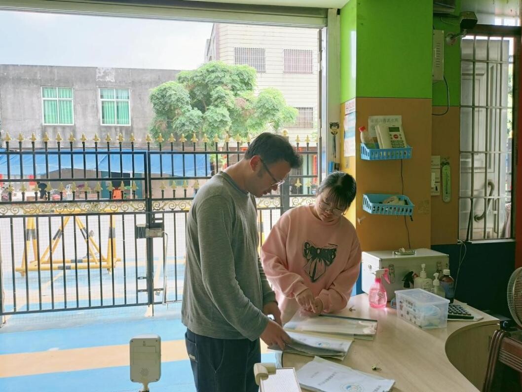 圖為公共服務(wù)辦檢查幼兒園入園、晨檢登記表