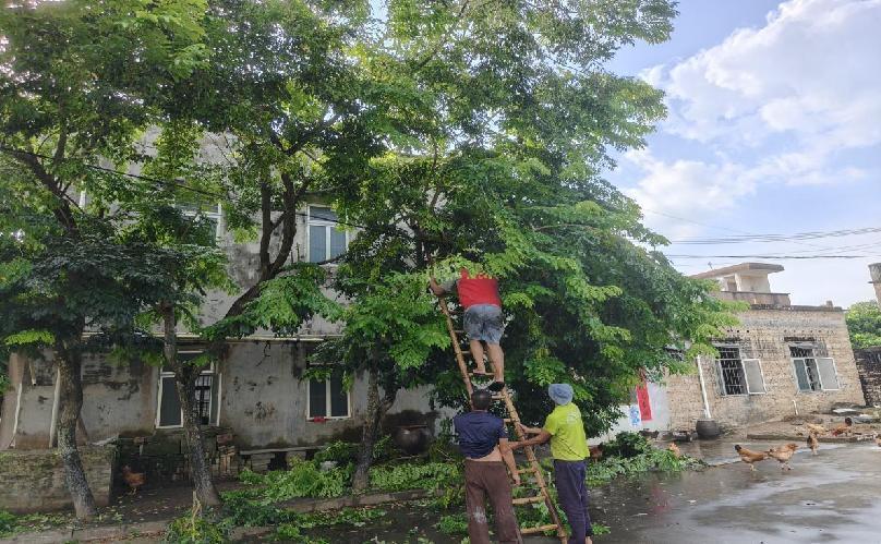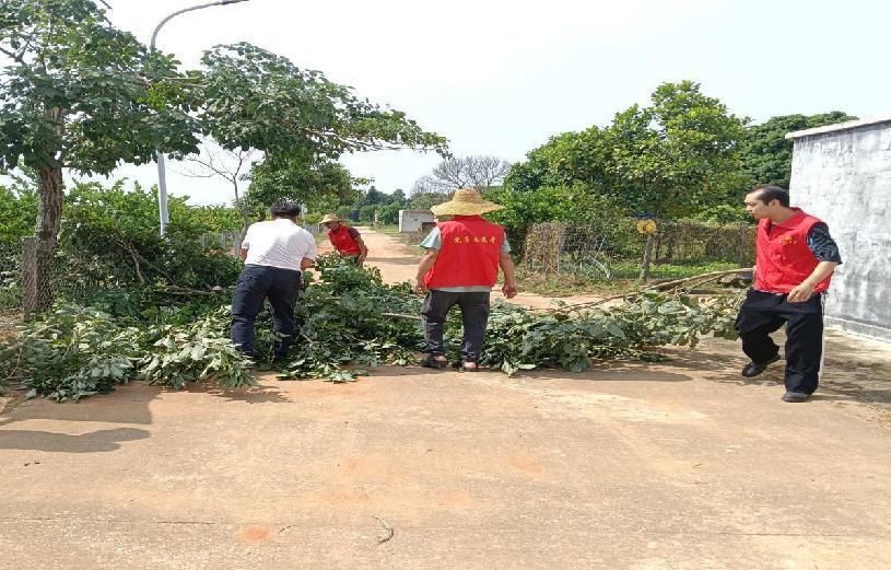 新楊村委會(huì)黨員先鋒隊(duì)排查安全隱患,修剪道路一旁的傾斜樹枝,做好防風(fēng)工作,確保過路群眾安全。