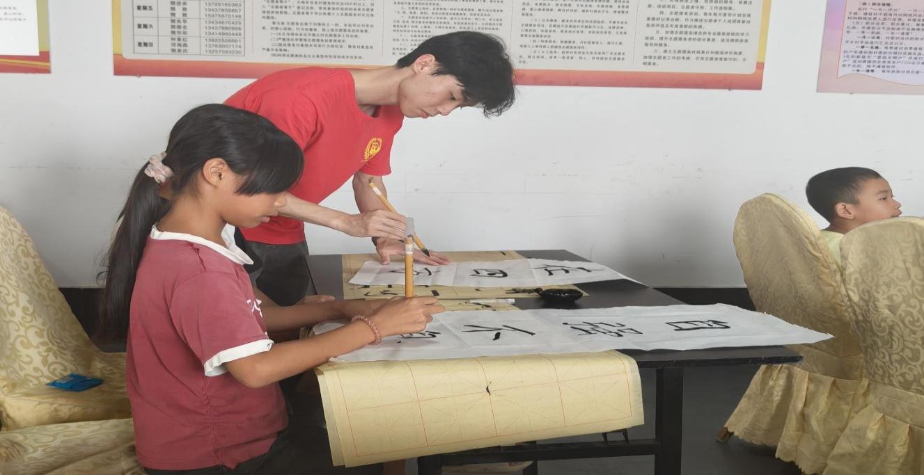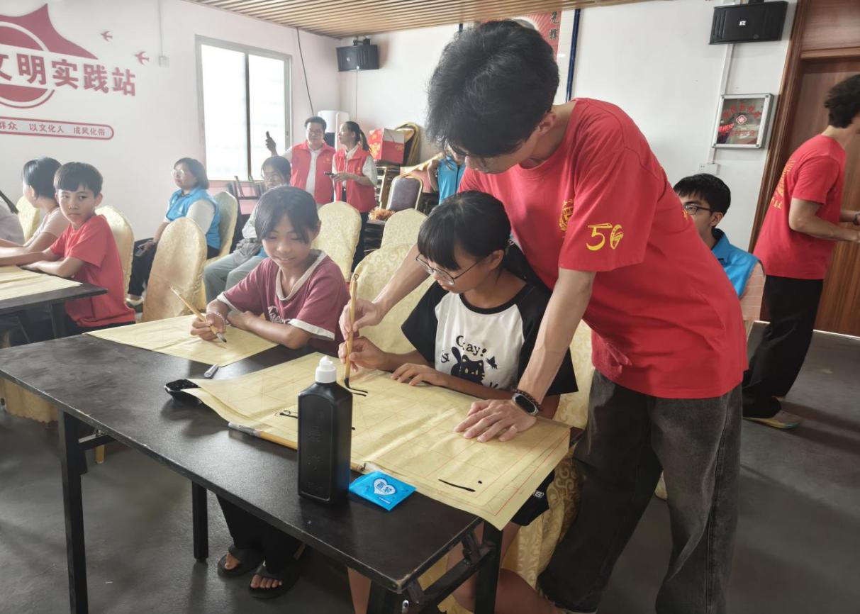 圖為志愿者耐心細(xì)致地向孩子們教授書法技藝