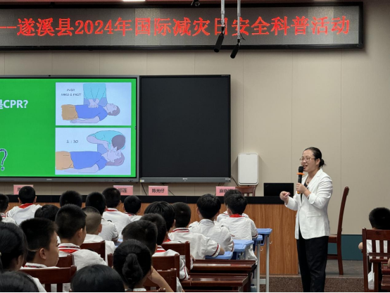邀請(qǐng)湛江市健康管理協(xié)會(huì)副會(huì)長(zhǎng)、廣東海洋大學(xué)運(yùn)動(dòng)與休閑學(xué)院麻曉鴿博士在遂城第一小學(xué)為師生們作專題講座。麻博士介紹了國(guó)際減災(zāi)日的來由以及應(yīng)急救援的基本知識(shí)。尤其詳細(xì)講解了CPR(心肺復(fù)蘇術(shù))減災(zāi)應(yīng)急知識(shí)和技能。麻博士通過生動(dòng)的案例、幽默的語言,為大家上了一堂精彩的科普課。課堂上,師生們積極參與互動(dòng),主動(dòng)參與現(xiàn)場(chǎng)實(shí)操,迅速掌握CPR知識(shí)要點(diǎn)和相關(guān)的減災(zāi)防災(zāi)的知識(shí)。