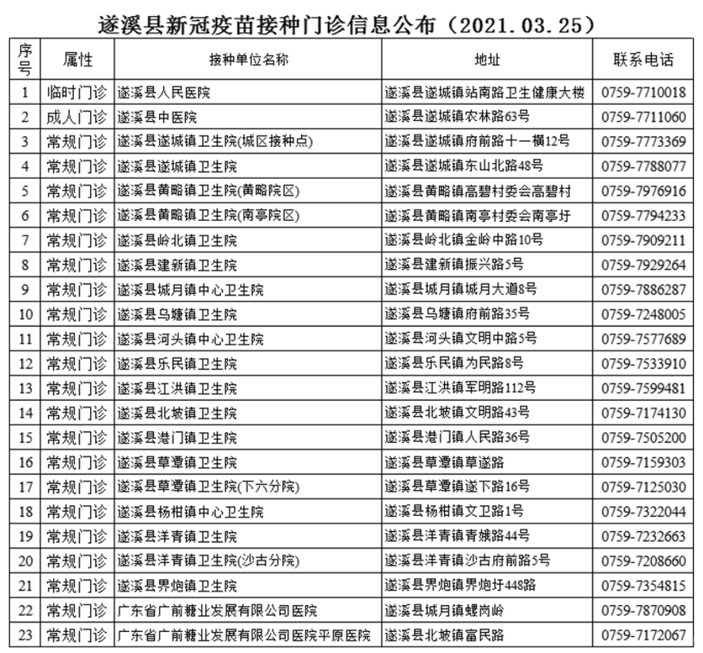 目前,我縣共設(shè)置新冠疫苗接種點(diǎn)23個(gè),覆蓋全縣15個(gè)鄉(xiāng)鎮(zhèn)。其中遂溪縣人民醫(yī)院臨時(shí)接種點(diǎn)1個(gè)、遂溪縣中醫(yī)院成人接種門診1個(gè)、15個(gè)鄉(xiāng)鎮(zhèn)衛(wèi)生院(含分院)的常規(guī)預(yù)防接種門診19個(gè)、廣前醫(yī)院和平原醫(yī)院常規(guī)預(yù)防接種門診各1個(gè)。