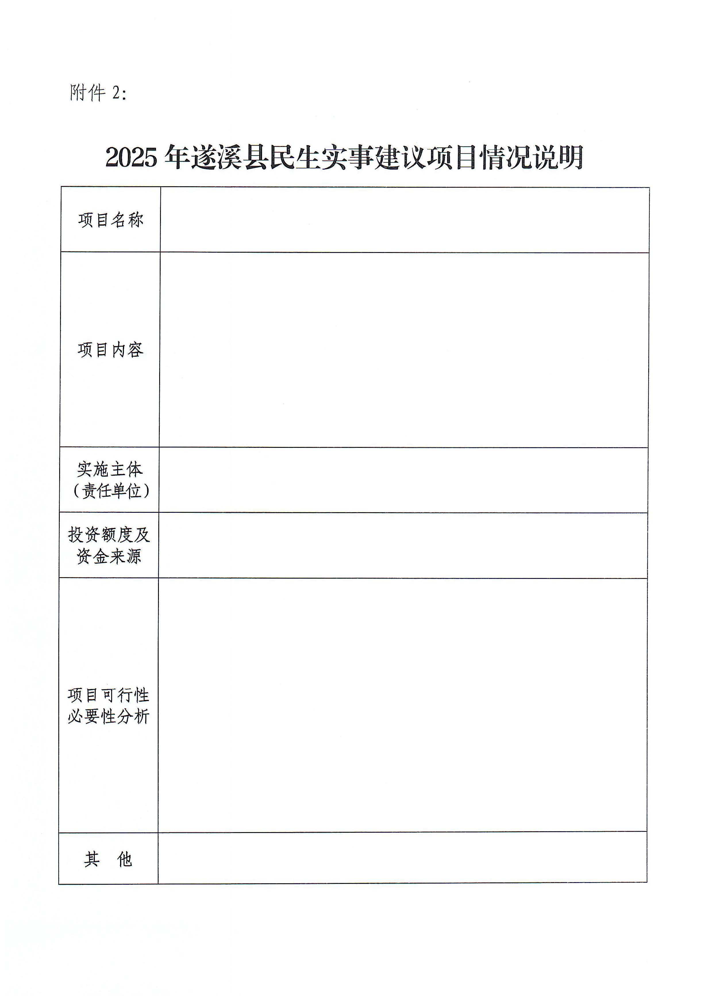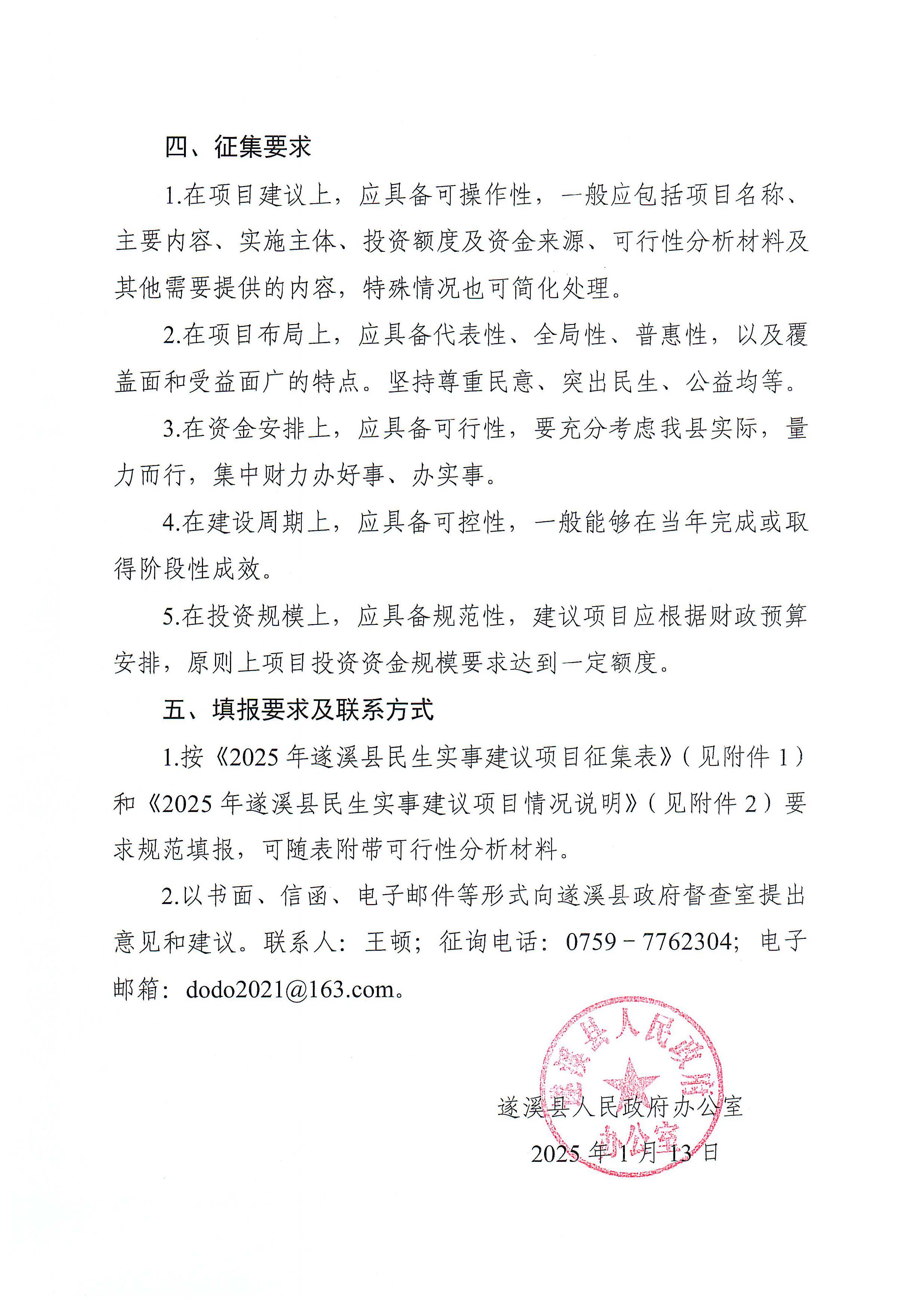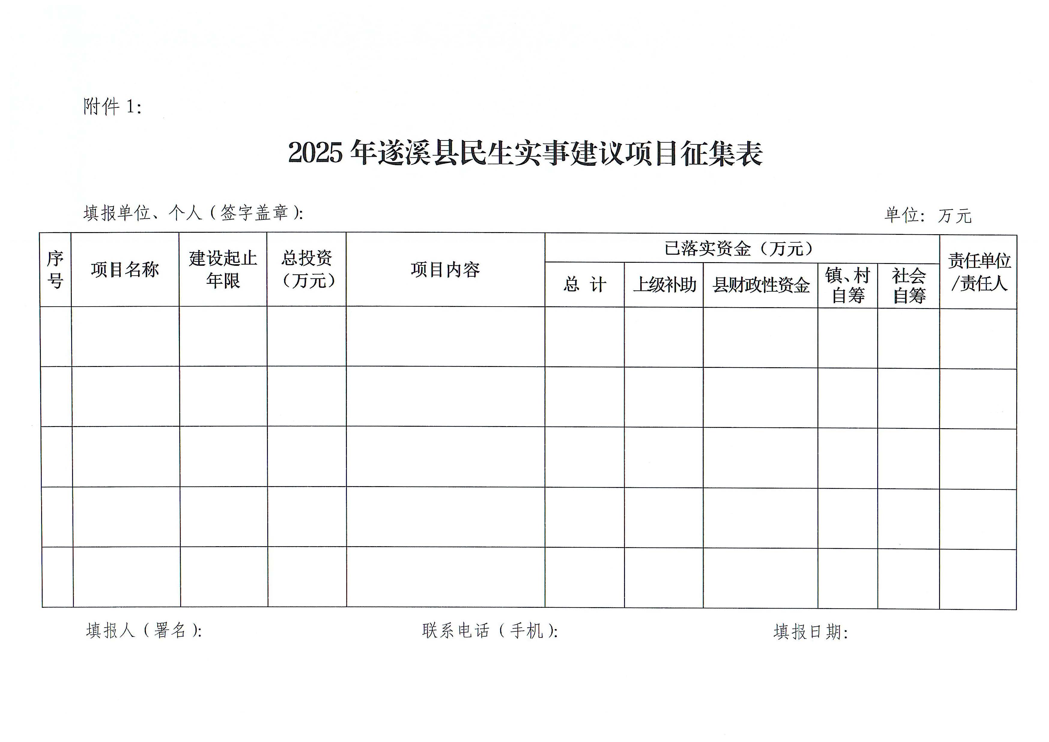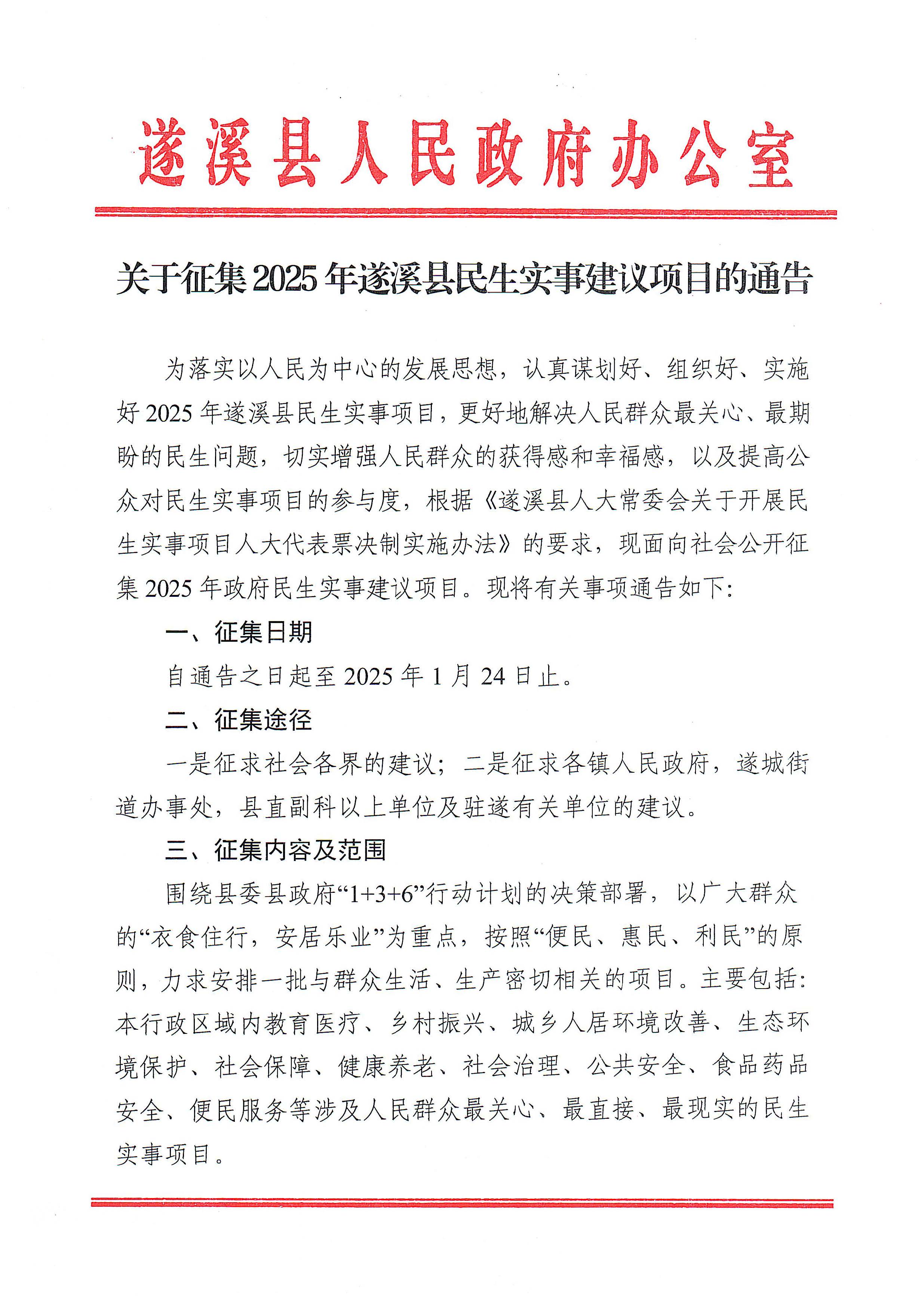 關(guān)于征集2025年遂溪縣民生實事建議項目的通告 | | 作者: | 來源:遂溪縣人民政府辦公室 | 時間:2025-01-17 10:49:27 點擊數(shù):- 附件1:2025年遂溪縣民生實事建議項目征集表.doc 附件2:2025年遂溪縣民生實事建議項目情況說明.doc 【打印正文】