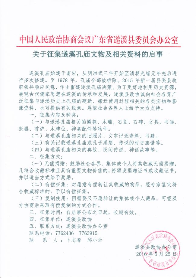 關(guān)于征集孔屆文物及相關(guān)資料的啟事 | | 作者:政協(xié) | 來源:政協(xié) | 時(shí)間:2016-05-27 15:10:22 點(diǎn)擊數(shù):- 【打印正文】