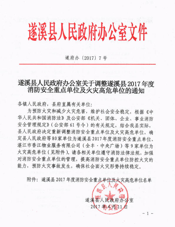 關(guān)于調(diào)整遂溪縣2017年度消防安全重點(diǎn)單位及火災(zāi)高危單位的通知 | | 作者: | 來(lái)源:本網(wǎng) | 時(shí)間:2017-04-17 10:10:49 點(diǎn)擊數(shù):- 【打印正文】