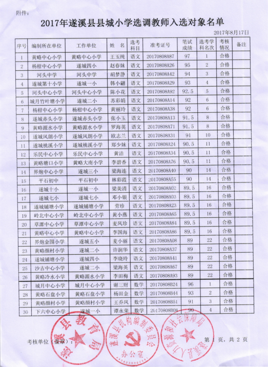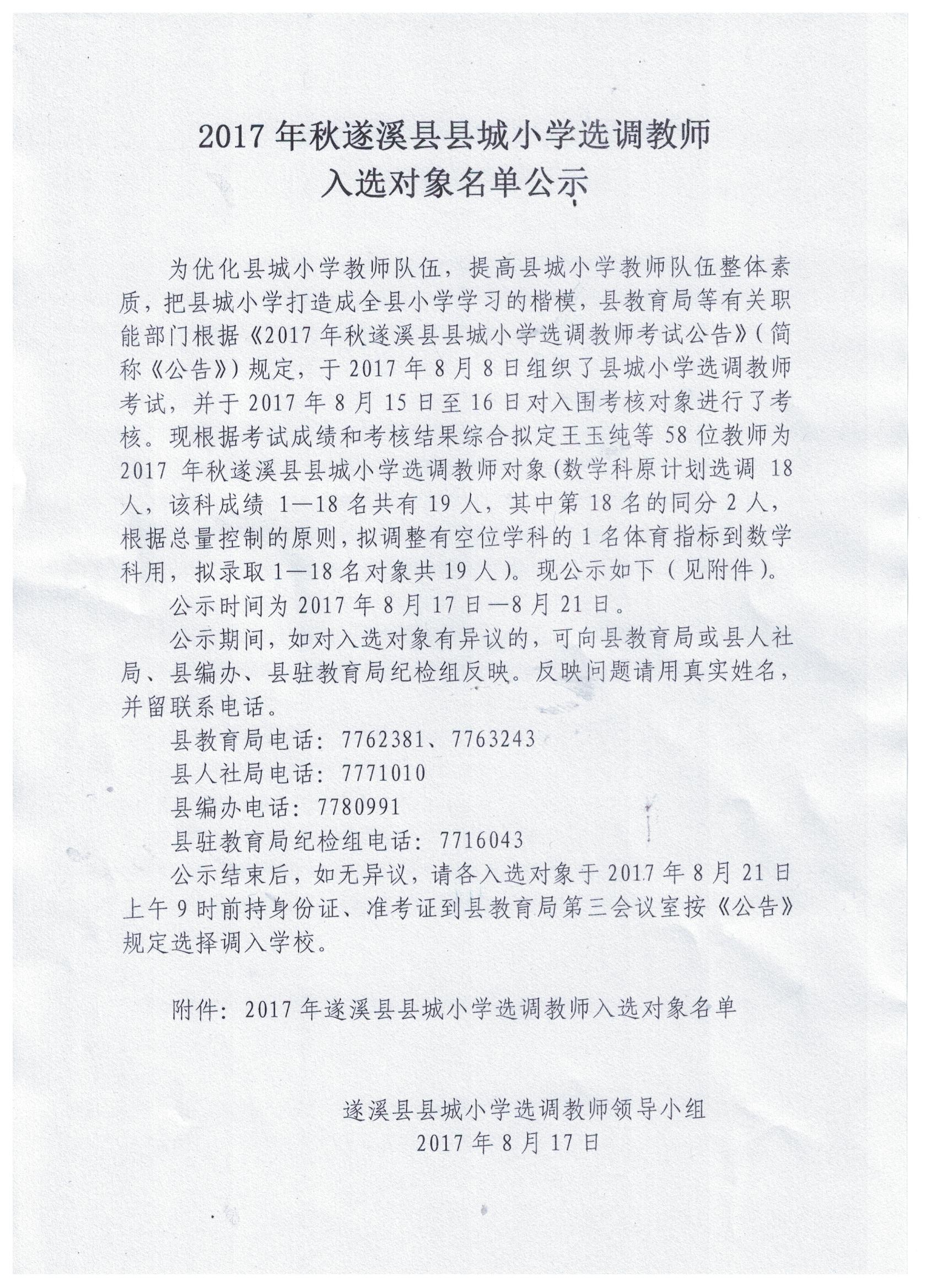 2017年秋遂溪縣縣城小學(xué)選調(diào)教師入選對象名單公示 | | 作者: | 來源:本網(wǎng) | 時間:2017-08-17 18:10:52 點擊數(shù):- 【打印正文】