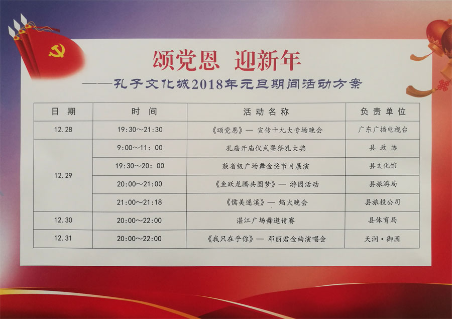 孔子文化城2018元旦期間活動(dòng)方案 | | 作者:縣人民政府 | 來(lái)源:縣人民政府 | 時(shí)間:2017-12-22 11:11:36 點(diǎn)擊數(shù):- 【打印正文】