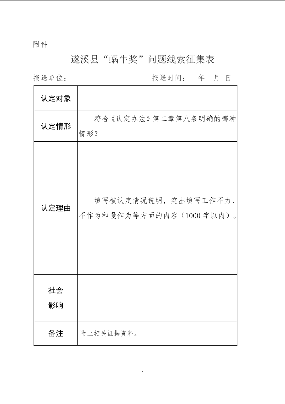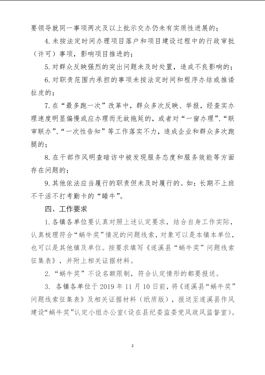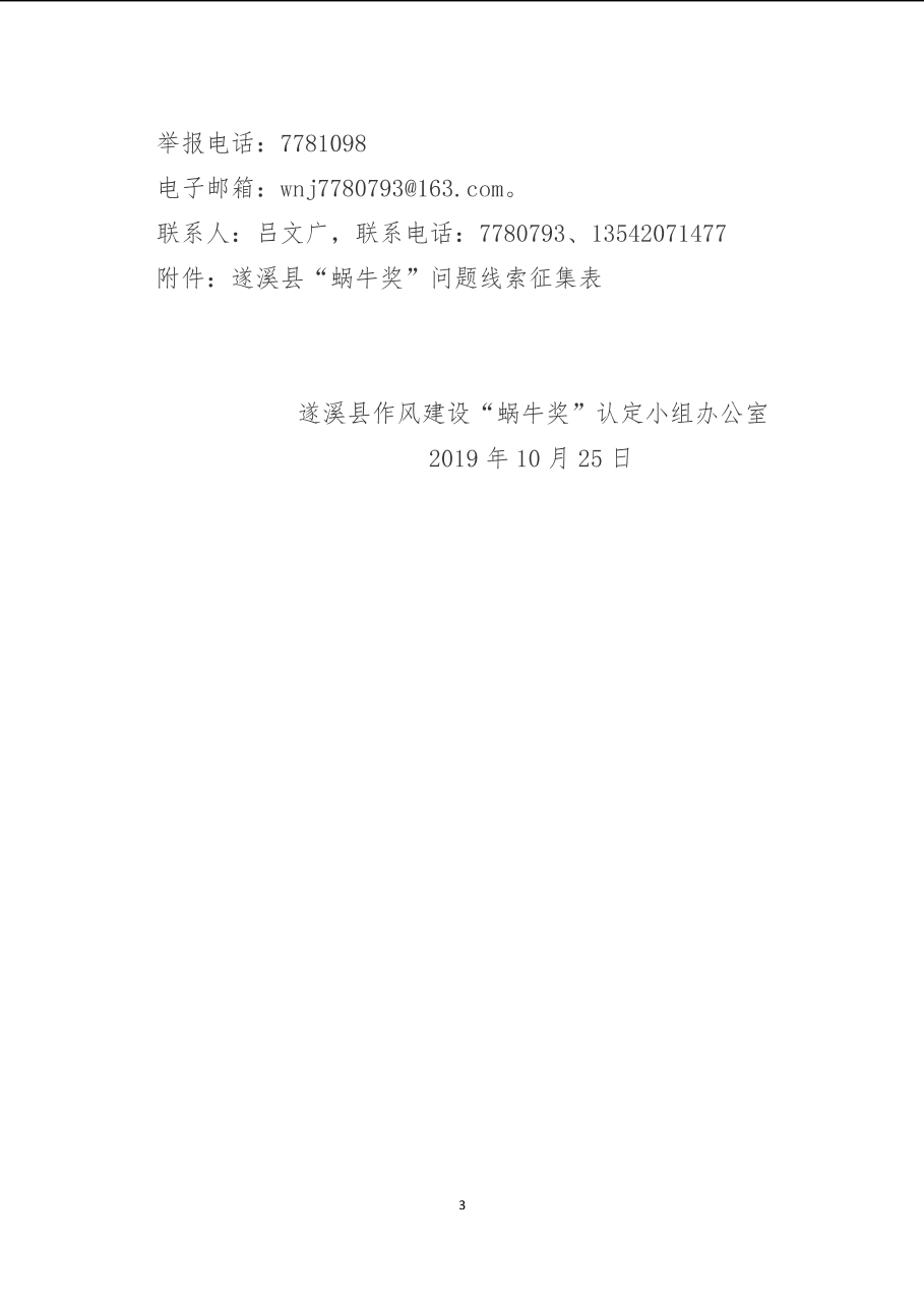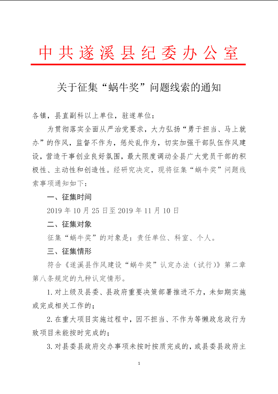 關(guān)于征集“蝸牛獎(jiǎng)”問(wèn)題線索的通知 | | 作者:遂溪縣作風(fēng)建設(shè)“蝸牛獎(jiǎng)”認(rèn)定小組辦公室 | 來(lái)源:遂溪縣作風(fēng)建設(shè)“蝸牛獎(jiǎng)”認(rèn)定小組辦公室 | 時(shí)間:2019-11-01 09:30:45 點(diǎn)擊數(shù):- 【打印正文】