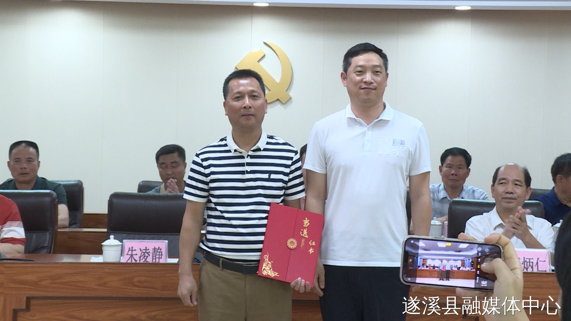 遂溪縣委常委、統(tǒng)戰(zhàn)部部長(zhǎng)朱凌靜等為當(dāng)選的各位成員頒發(fā)證書(shū),并為洋青鎮(zhèn)商會(huì)揭牌。