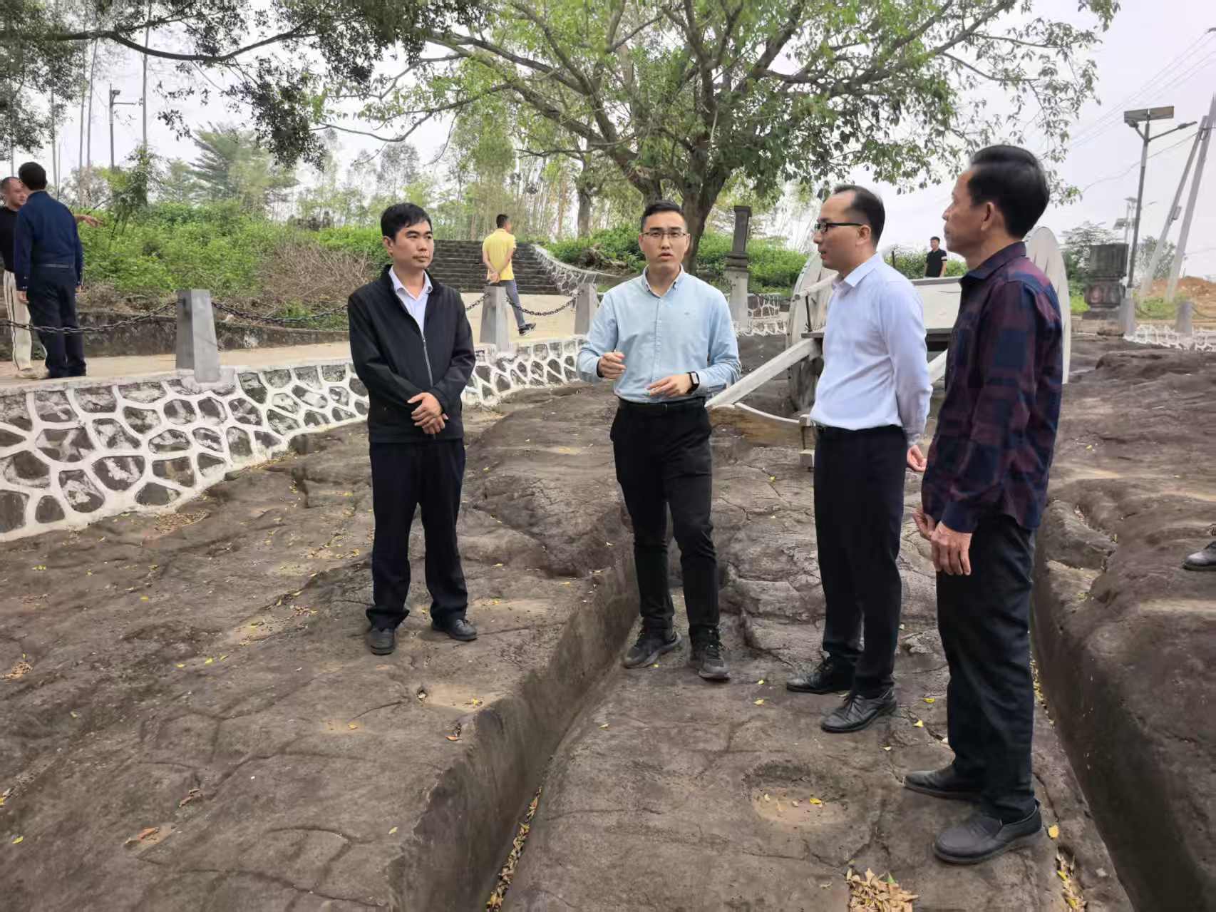 在嶺北鎮(zhèn)調(diào)豐古官道遺址,調(diào)研組一行實地察看古車轍保護工作,詳細了解千年古官道“車同軌”的歷史考究和南粵古驛道文旅項目進展情況。調(diào)研組要求,將南粵古驛道、孔子文化城、北部灣農(nóng)旅產(chǎn)業(yè)園和嶺北典型鎮(zhèn)、典型村連線成片,以農(nóng)業(yè)為基礎(chǔ)、文化為靈魂、旅游為載體,打造農(nóng)文旅融合新標桿。