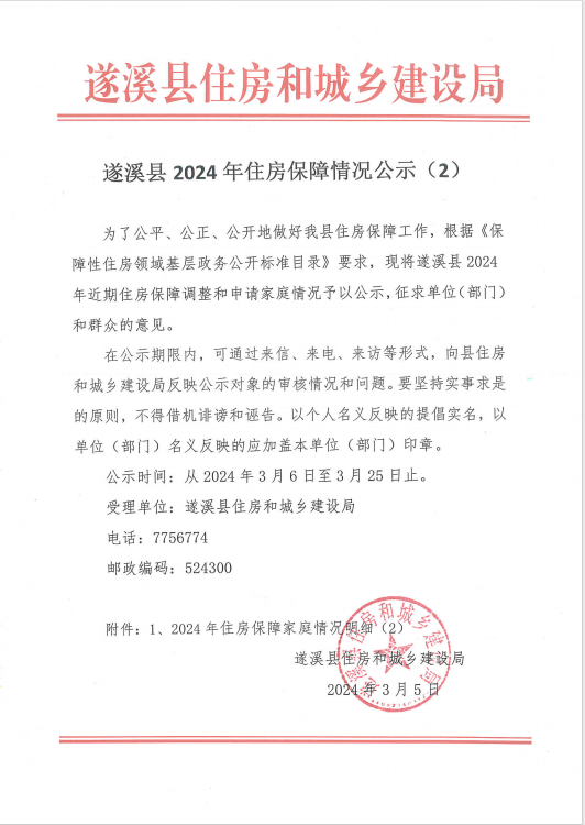 遂溪縣2024年住房保障情況公示(2) | | 作者: | 來源:遂溪縣住房和城鄉(xiāng)建設(shè)局 | 時間:2024-03-05 17:01:14 點擊數(shù):- 遂溪縣2024年住房保障情況公示(2).pdf 【打印正文】