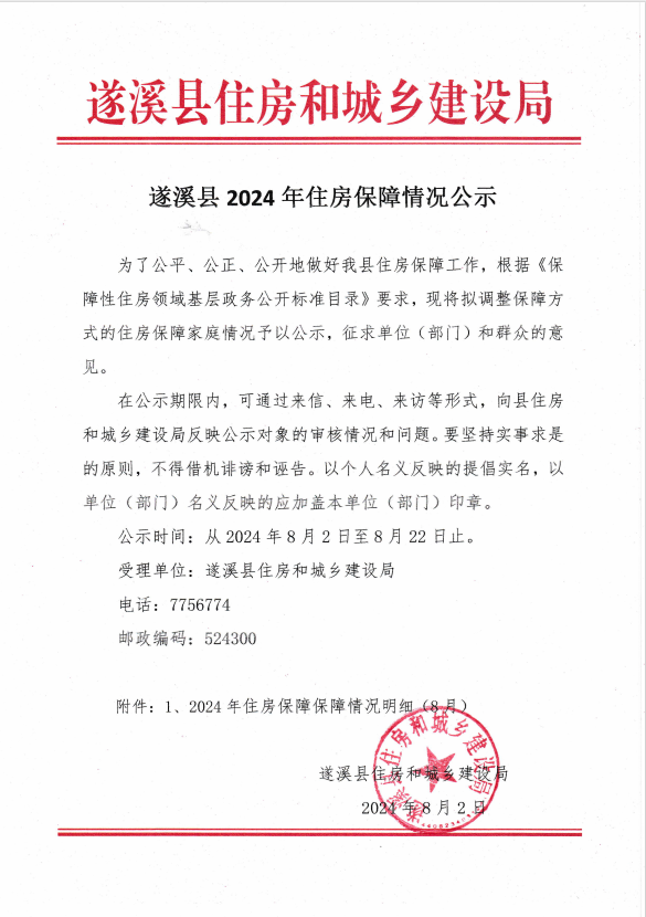 遂溪縣2024年住房保障情況公示 | | 作者: | 來源:遂溪縣住房和城鄉(xiāng)建設(shè)局 | 時(shí)間:2024-08-02 10:33:40 點(diǎn)擊數(shù):- 2024年住房保障調(diào)整家庭明細(xì)(202408).xlsx 【打印正文】