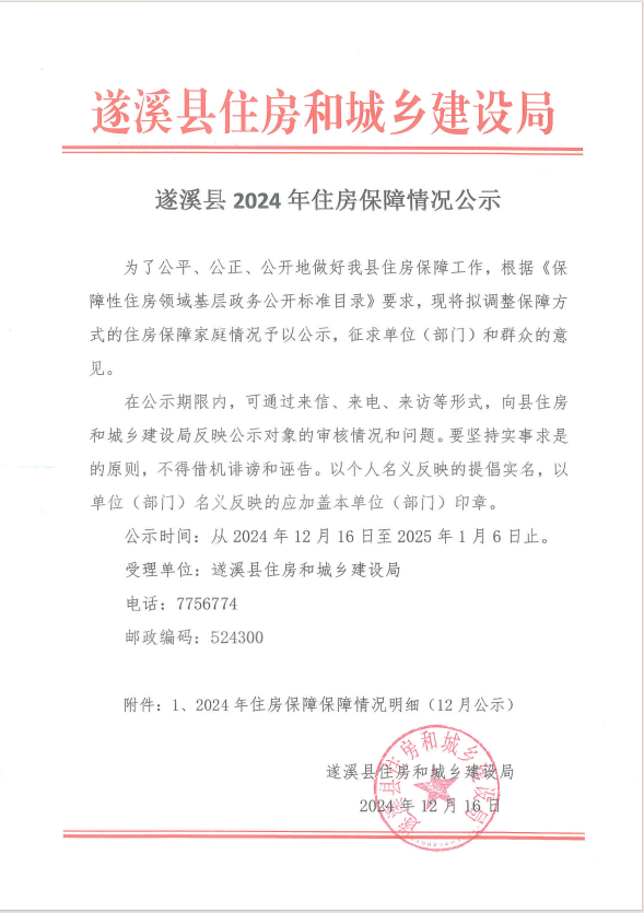 遂溪縣2024年住房保障情況公示 | | 作者: | 來源:遂溪縣住房和城鄉(xiāng)建設(shè)局 | 時(shí)間:2024-12-16 18:27:30 點(diǎn)擊數(shù):- 2024年住房保障調(diào)整家庭明細(xì)(12月公示).xlsx 【打印正文】