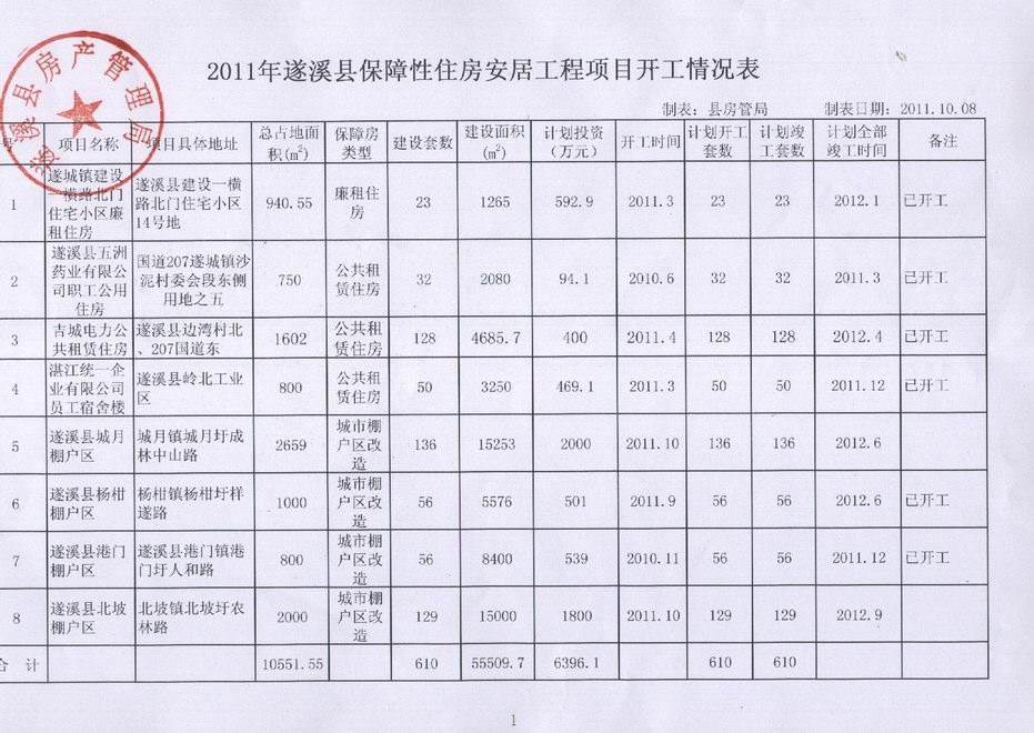 2011年遂溪縣保障性住房安居工程項目開工情況表