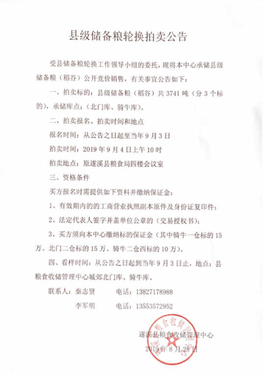 縣級(jí)儲(chǔ)備糧輪換銷售拍賣公告2019.8