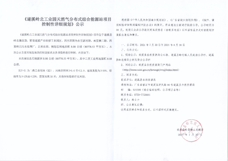 《遂溪嶺北工業(yè)園天然氣分布式綜合能源站項(xiàng)目控制性詳細(xì)規(guī)劃》公示 | | 作者: | 來(lái)源:遂溪縣自然資源局 | 時(shí)間:2021-07-30 10:11:25 點(diǎn)擊數(shù):- 【打印正文】