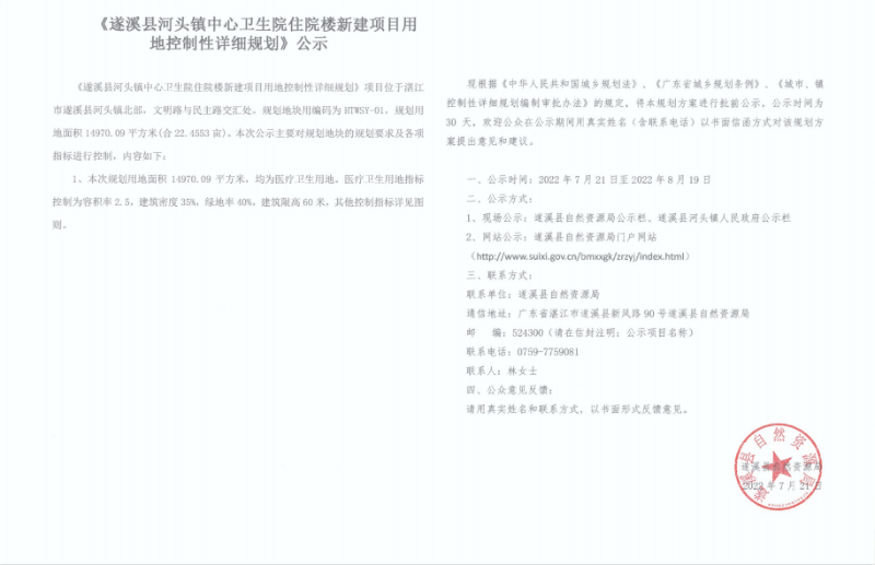 關(guān)于《遂溪縣河頭鎮(zhèn)中心衛(wèi)生院住院樓新建項目用地控制性詳細規(guī)劃》的公示 | | 作者: | 來源:遂溪縣自然資源局 | 時間:2022-07-21 10:32:26 點擊數(shù):- 【打印正文】