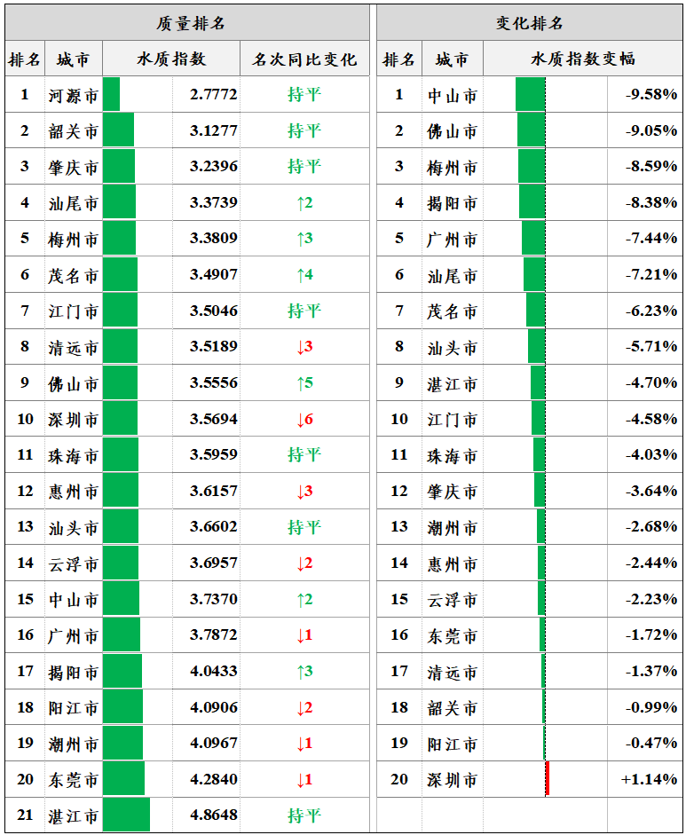 城市排名:1-11月,基于270個(gè)省考斷面水質(zhì)監(jiān)測結(jié)果,城市水質(zhì)指數(shù)較高的是河源、韶關(guān)和肇慶市,較低的是湛江、東莞和潮州市。中山、佛山和梅州等19市水環(huán)境質(zhì)量同比有所改善,深圳市同比有所下降(河源市所有省考斷面均達(dá)到水質(zhì)目標(biāo)且均達(dá)到或優(yōu)于Ⅱ類,不參與水質(zhì)變化排名)。