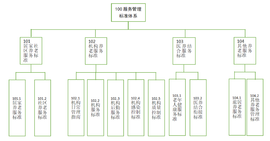 100服務(wù)管理標(biāo)準(zhǔn)子體系是在養(yǎng)老服務(wù)領(lǐng)域中,為滿足老年人的需要,規(guī)范服務(wù)提供方與服務(wù)對象之間直接或間接接觸活動過程的標(biāo)準(zhǔn),含居家社區(qū)養(yǎng)老服務(wù)、機(jī)構(gòu)養(yǎng)老服務(wù)、醫(yī)養(yǎng)結(jié)合服務(wù)及旅居養(yǎng)老等其他養(yǎng)老服務(wù)形態(tài)的服務(wù)質(zhì)量要求和管理標(biāo)準(zhǔn)。本子體系的著重點(diǎn)在探索各類養(yǎng)老服務(wù)和服務(wù)管理過程中的相關(guān)標(biāo)準(zhǔn)。