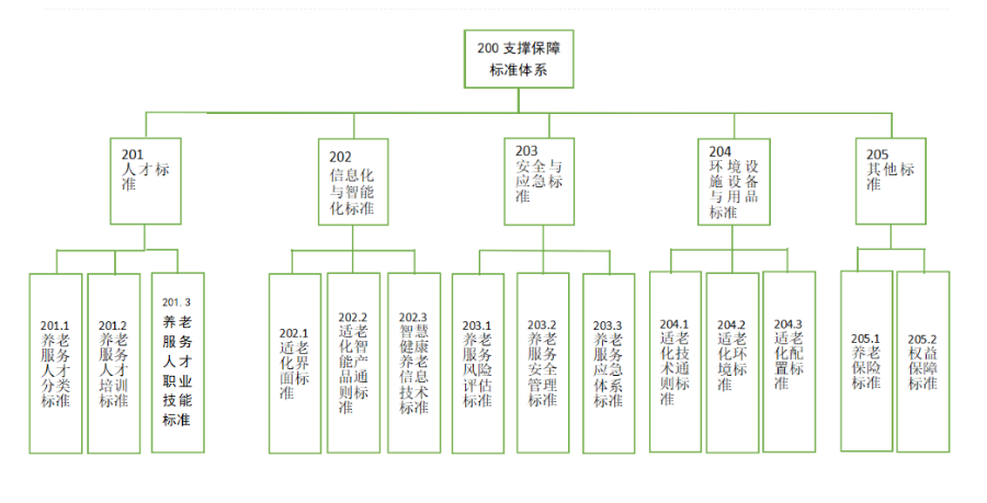200支撐保障標(biāo)準(zhǔn)是指在養(yǎng)老服務(wù)領(lǐng)域內(nèi),為支撐養(yǎng)老服務(wù)行業(yè)中各項工作有效開展而形成的標(biāo)準(zhǔn),包括人才、設(shè)備、環(huán)境、信息、安全等標(biāo)準(zhǔn)。本子體系的重點(diǎn)在養(yǎng)老服務(wù)人才培養(yǎng)、社區(qū)養(yǎng)老服務(wù)設(shè)施建設(shè)標(biāo)準(zhǔn)、智慧養(yǎng)老、老年用品、機(jī)構(gòu)消防安全、安全應(yīng)急處置等相關(guān)領(lǐng)域的標(biāo)準(zhǔn)。