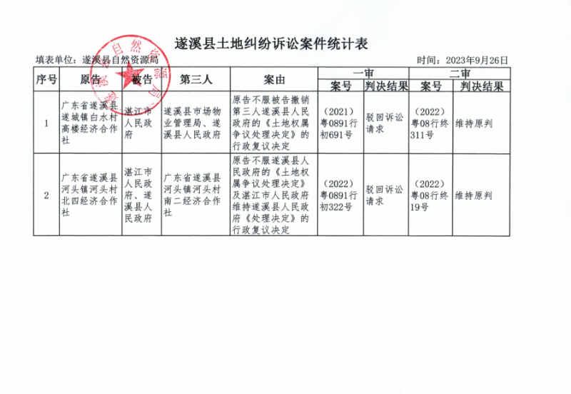 遂溪縣土地糾紛訴訟案件統(tǒng)計表