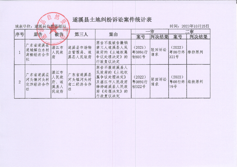 遂溪縣土地糾紛訴訟案件統(tǒng)計(jì)表(10月) | | 作者: | 來源:遂溪縣自然資源局 | 時(shí)間:2023-10-25 16:24:12 點(diǎn)擊數(shù):- 【打印正文】