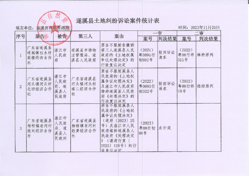 遂溪縣土地糾紛訴訟案件統(tǒng)計表(11月)