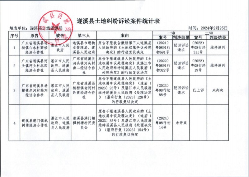遂溪縣土地糾紛訴訟案件統(tǒng)計(jì)表
