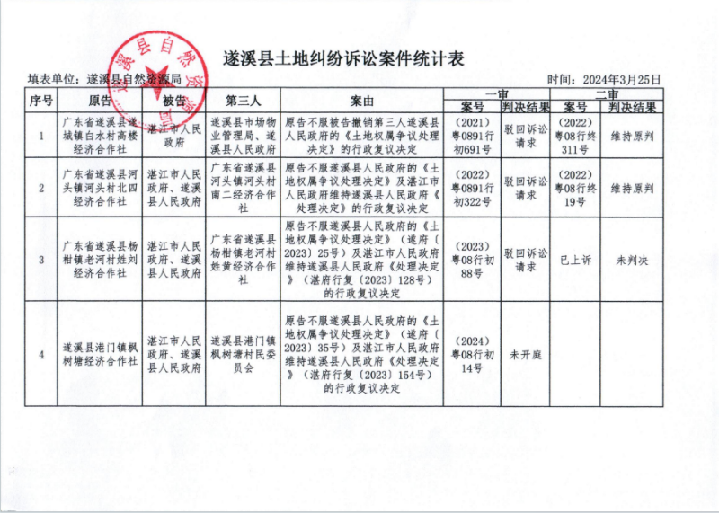 遂溪縣土地糾紛訴訟案件統(tǒng)計表