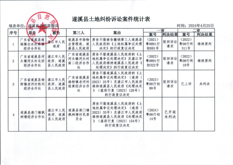 遂溪縣土地糾紛訴訟案件統(tǒng)計(jì)表