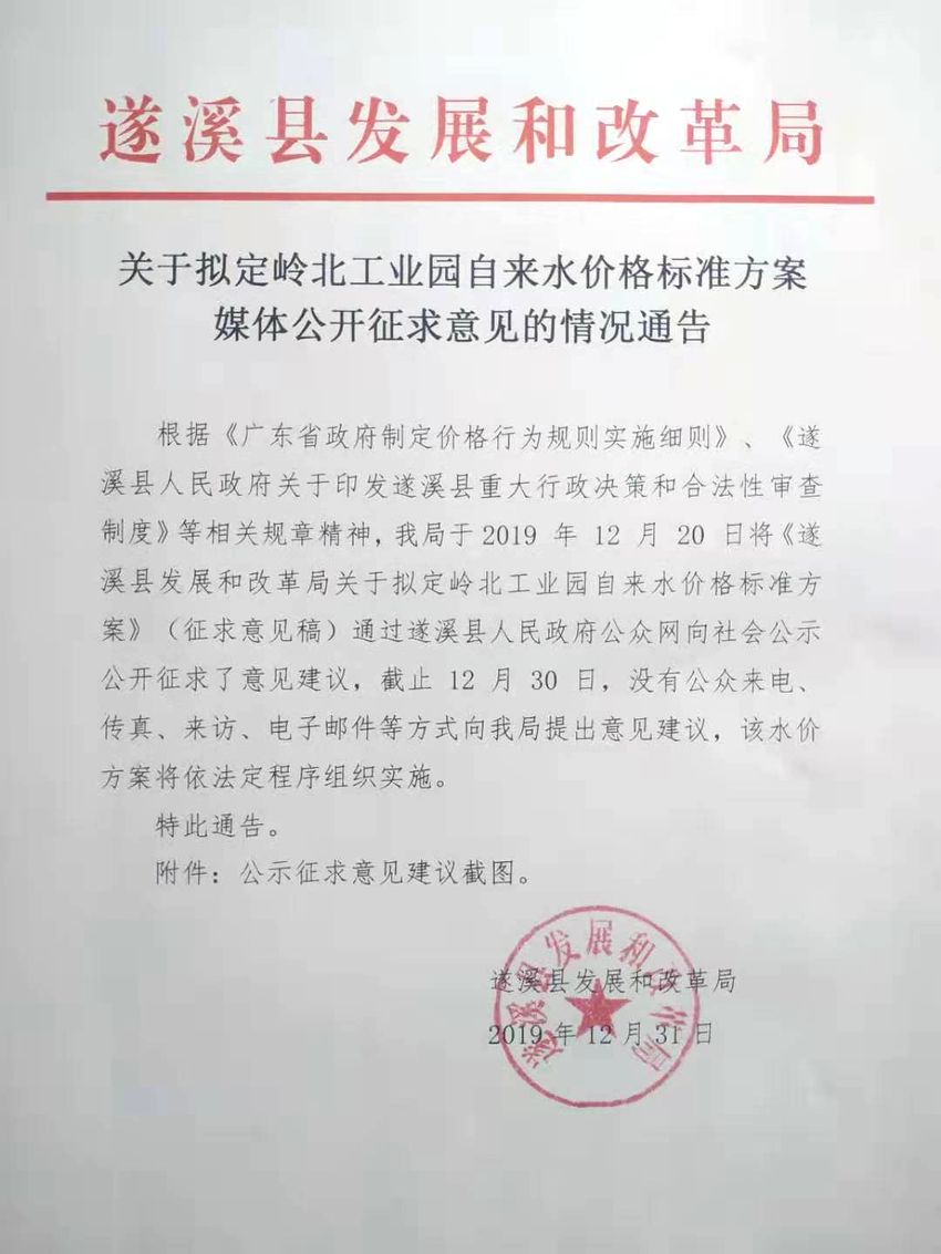 關于擬定嶺北工業(yè)園自來水價格標準方案媒體公開征求意見的情況通告