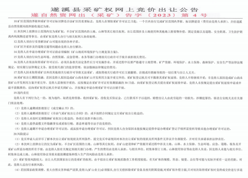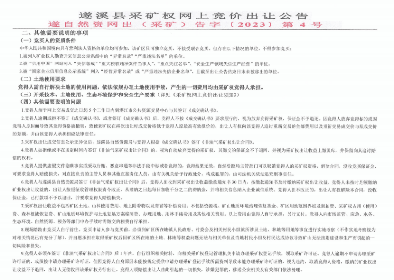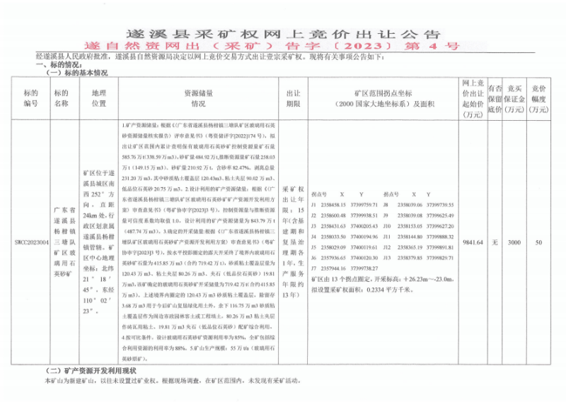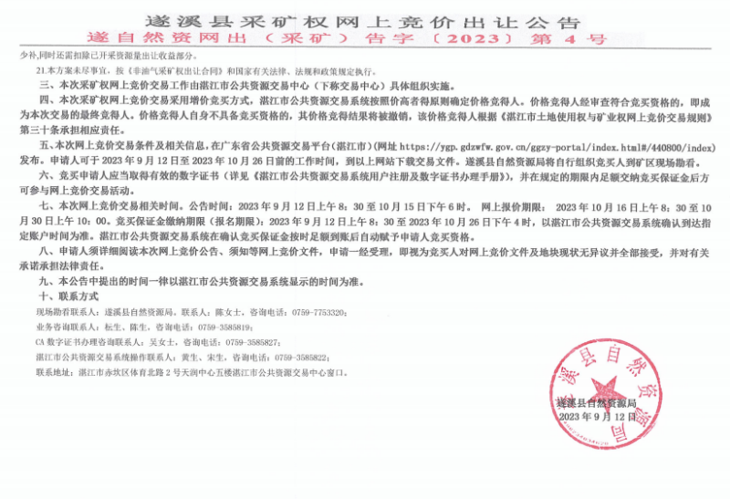 遂溪縣楊柑鎮(zhèn)三塘隊礦區(qū)采礦權(quán)網(wǎng)上競價出讓公告及采礦權(quán)網(wǎng)上競價出讓須知 | | 作者: | 來源:遂溪縣自然資源局 | 時間:2023-09-12 10:58:28 點(diǎn)擊數(shù):- 附件:采礦權(quán)網(wǎng)上競價出讓須知.pdf 【打印正文】