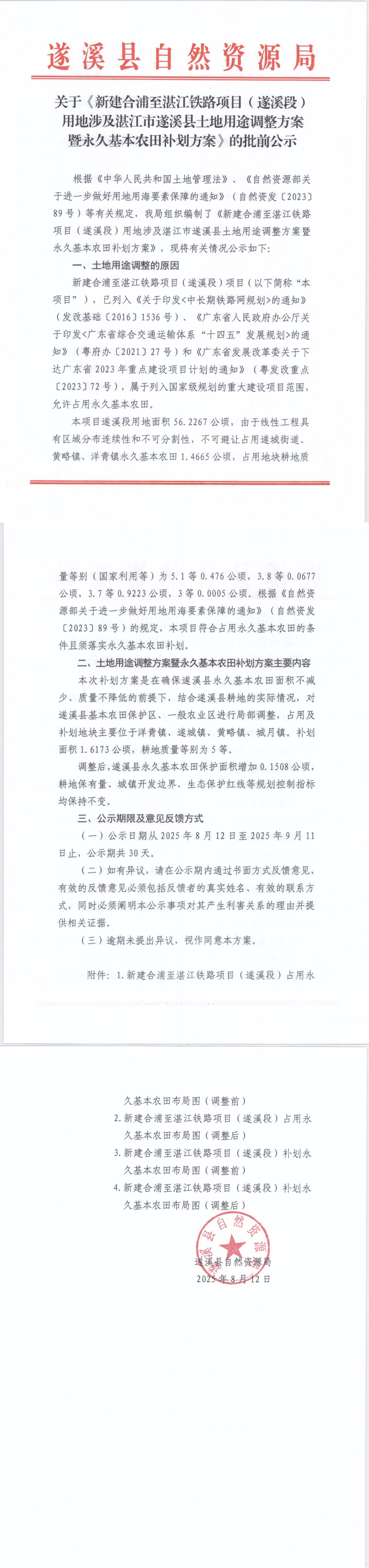 關(guān)于《新建合浦至湛江鐵路項(xiàng)目(遂溪段)用地涉及湛江市遂溪縣土地用途調(diào)整方案暨永久基本農(nóng)田補(bǔ)劃方案》的批前公示 | | 作者: | 來(lái)源:遂溪縣自然資源局 | 時(shí)間:2025-08-12 16:05:43 點(diǎn)擊數(shù):- 附件1:新建合浦至湛江鐵路項(xiàng)目(遂溪段)占用永久基本農(nóng)田布局圖(調(diào)整前)附件2:新建合浦至湛江鐵路項(xiàng)目(遂溪段)占用永久基本農(nóng)田布局圖(調(diào)整后)附件3:新建合浦至湛江鐵路項(xiàng)目(遂溪段)補(bǔ)劃永久基本農(nóng)田布局圖(調(diào)整前)附件4:新建合浦至湛江鐵路項(xiàng)目(遂溪段)補(bǔ)劃永久基本農(nóng)田布局圖(調(diào)整后) 【打印正文】
