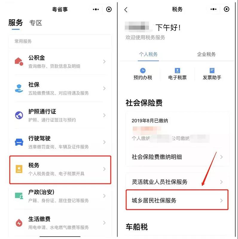 1. 在“粵省事”微信小程序首頁點擊“稅務(wù)”服務(wù),在個人稅務(wù)版塊找到“社會保險費”——“城鄉(xiāng)居民社保服務(wù)”,點擊“城鄉(xiāng)居民社保服務(wù)”。