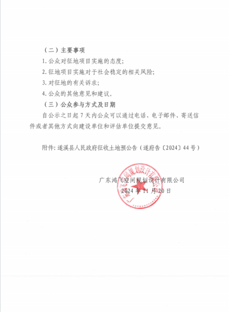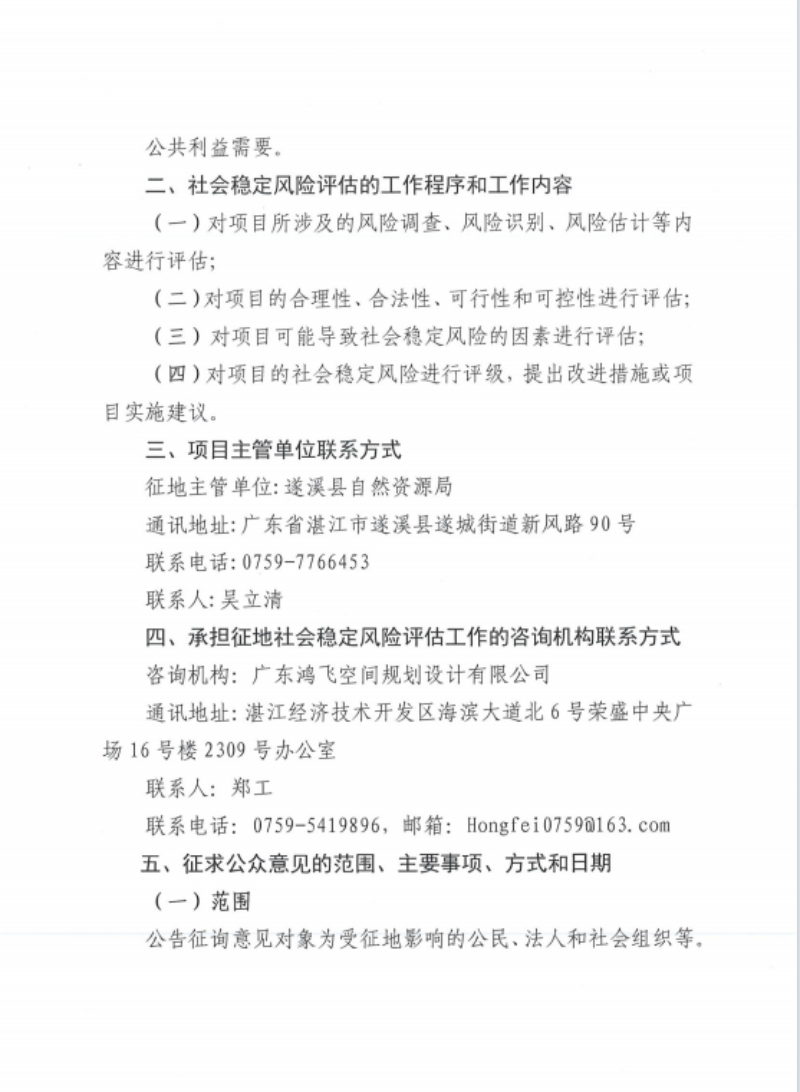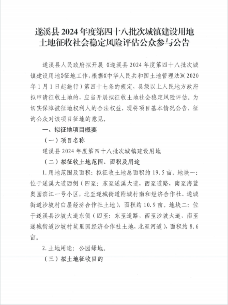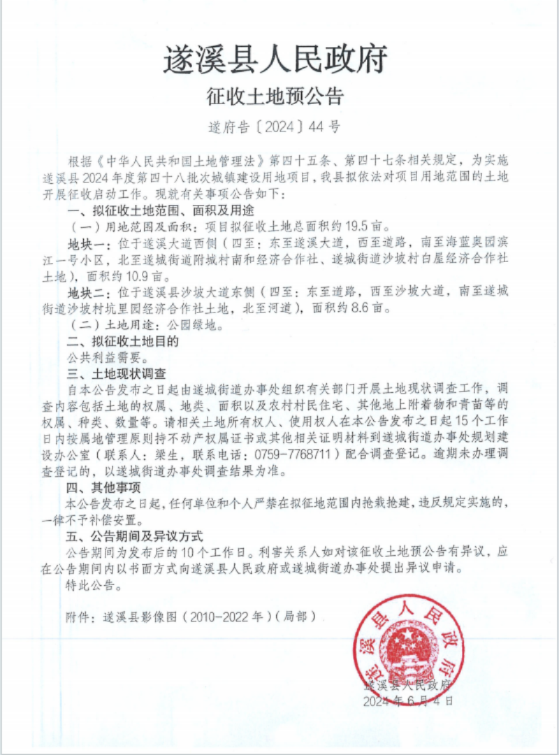 遂溪縣2024年度第四十八批次城鎮(zhèn)建設(shè)用地土地征收社會穩(wěn)定風險評估公眾參與公告 | | 作者: | 來源:遂溪縣自然資源局 | 時間:2024-12-03 15:56:47 點擊數(shù):- 【打印正文】