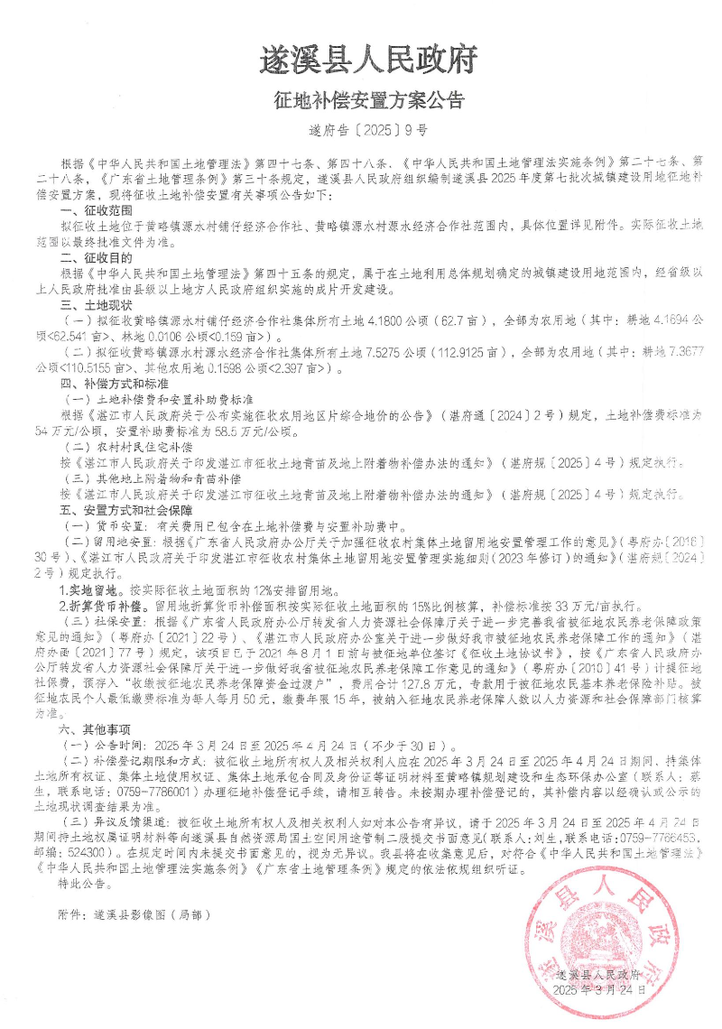 遂溪縣人民政府 征地補(bǔ)償安置方案公告 遂府告〔2025〕9號(hào) | | 作者: | 來(lái)源:遂溪縣自然資源局 | 時(shí)間:2025-03-24 14:58:27 點(diǎn)擊數(shù):- 【打印正文】