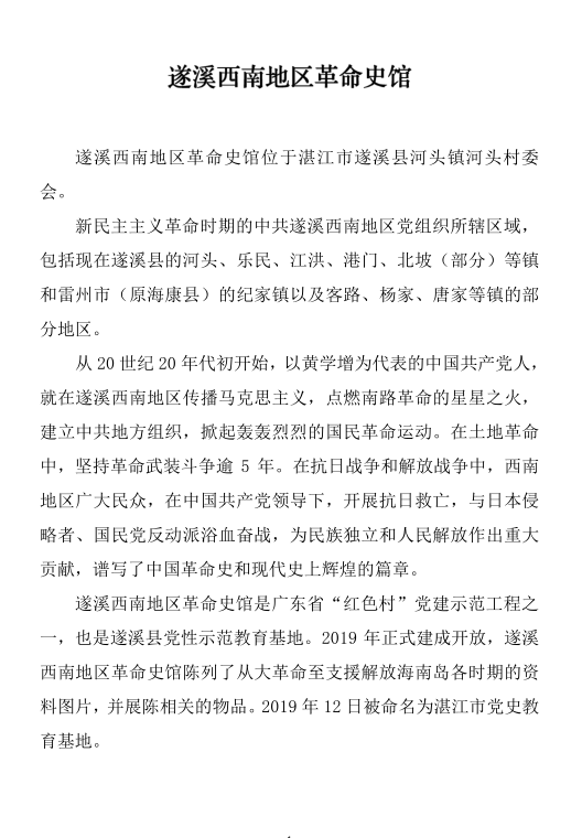 遂溪西南地區(qū)革命史館 | | 作者: | 來(lái)源:中共遂溪縣委黨史研究室 | 時(shí)間:2021-08-26 16:11:41 點(diǎn)擊數(shù):- 遂溪西南地區(qū)革命史館.pdf 【打印正文】