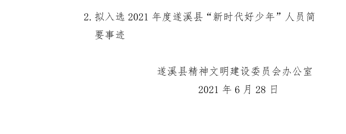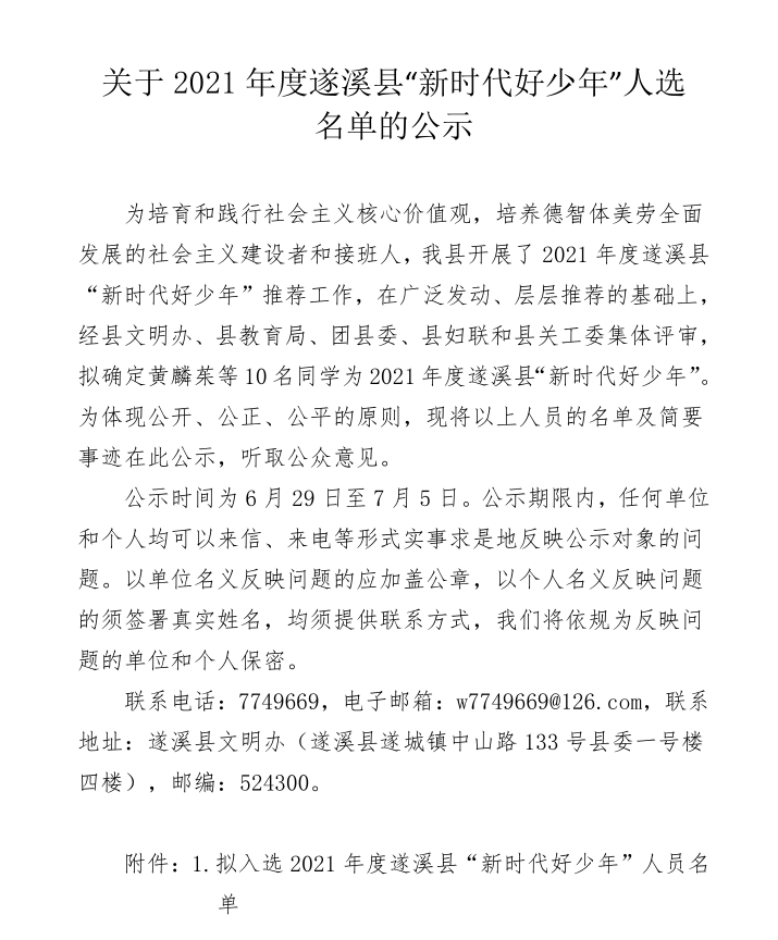 關(guān)于擬入選2021年度遂溪縣“新時(shí)代好少年”人員的公示 | | 作者: | 來(lái)源:遂溪縣精神文明建設(shè)委員會(huì)辦公室 | 時(shí)間:2021-06-28 10:37:14 點(diǎn)擊數(shù):- 關(guān)于擬入選2021年度遂溪縣“新時(shí)代好少年”人員的公示.pdf 【打印正文】