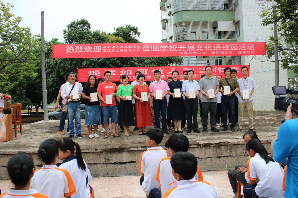 5 月 20 日下午,由遂溪縣創(chuàng)文辦、建新鎮(zhèn)政府、建新鎮(zhèn)初級中學(xué)聯(lián)合主辦的“文化進校園”活動在建新鎮(zhèn)初級中學(xué)舉行。著名詩人、國家一級作家洪三泰出席并作了“如何做人和當(dāng)作家” 的主題講座。湛江紅土詩社詩人和建新鎮(zhèn)初級中學(xué)師生共400多人參加。《湛江日報》副總編輯、《湛江晚報》總編輯陳通,縣政協(xié)副主席、縣創(chuàng)文工作領(lǐng)導(dǎo)小組執(zhí)行副組長、縣創(chuàng)文辦主任張閩英,縣委宣傳部副部長周虹出席活動。