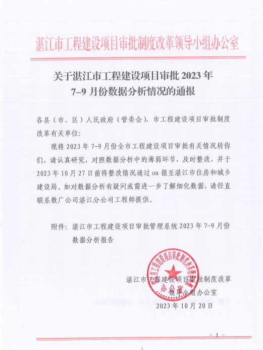 關(guān)于湛江市工程建設(shè)項(xiàng)目審批2023年7-9月份數(shù)據(jù)分析情況的通報(bào) | | 作者: | 來(lái)源:湛江市工程建設(shè)項(xiàng)目審批制度改革領(lǐng)導(dǎo)小組辦公室 | 時(shí)間:2023-11-01 11:46:58 點(diǎn)擊數(shù):- 詳見(jiàn)附件:關(guān)于湛江市工程建設(shè)項(xiàng)目審批2023年7-9月份數(shù)據(jù)分析情況的通報(bào).pdf 【打印正文】