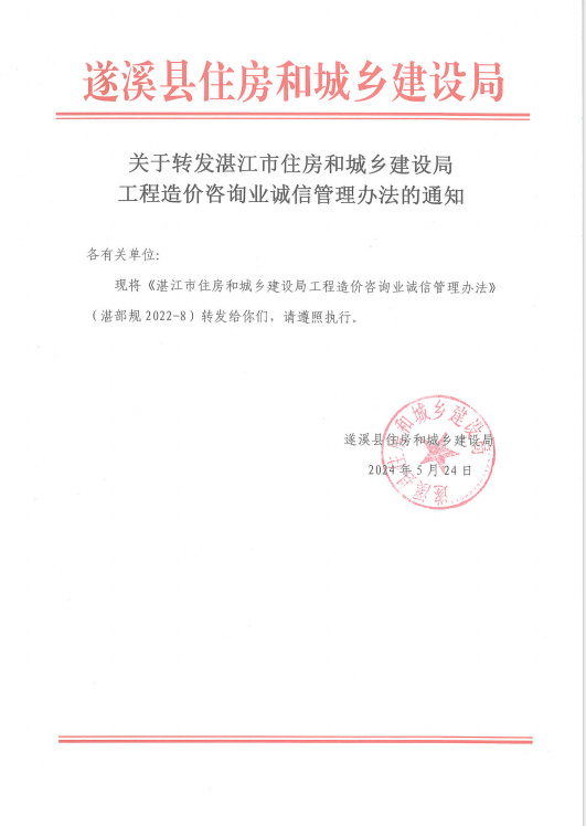關(guān)于轉(zhuǎn)發(fā)湛江市住房和城鄉(xiāng)建設(shè)局工程造價咨詢業(yè)誠信管理辦法的通知 | | 作者: | 來源:遂溪縣住房和城鄉(xiāng)建設(shè)局 | 時間:2024-05-24 17:32:05 點擊數(shù):- 詳見附件:關(guān)于印發(fā)《湛江市住房和城鄉(xiāng)建設(shè)局工程造價咨詢業(yè)誠信管理辦法》的通知.pdf 【打印正文】