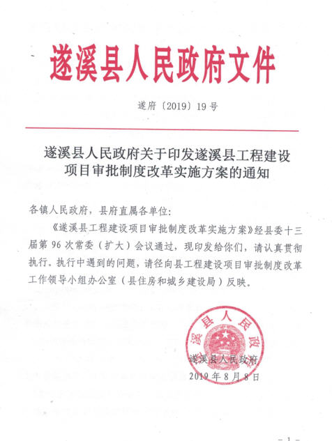 遂溪縣人民政府關于印發(fā)遂溪縣工程建設項目審批制度改革實施方案的通知(遂府〔2019〕19號) | | 作者: | 來源:本網 | 時間:2019-08-10 08:58:25 點擊數(shù):- 遂溪縣人民政府關于印發(fā)遂溪縣工程建設項目審批制度改革實施方案的通知(遂府〔2019〕19號) 【打印正文】