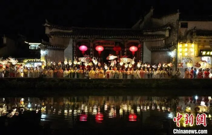 資料圖:安徽省黃山市黟縣宏村舉行“花燈邀明月 歡樂度中秋”花燈游園會(huì),人們舞動(dòng)繽紛多彩的花燈漫步在古村中,邂逅良辰美景,在燈火月影中感受傳統(tǒng)文化魅力,喜迎中秋佳節(jié)。(無人機(jī)照片)施亞磊 攝