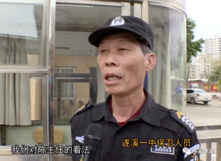 遂溪縣第一中學(xué) 保衛(wèi)人員:我們對陳主任的看法,他有著高尚的品德,思想覺悟比較高,對學(xué)校的責(zé)任心很強,他的工作很好,管理我們保安很專業(yè),他很有責(zé)任心。