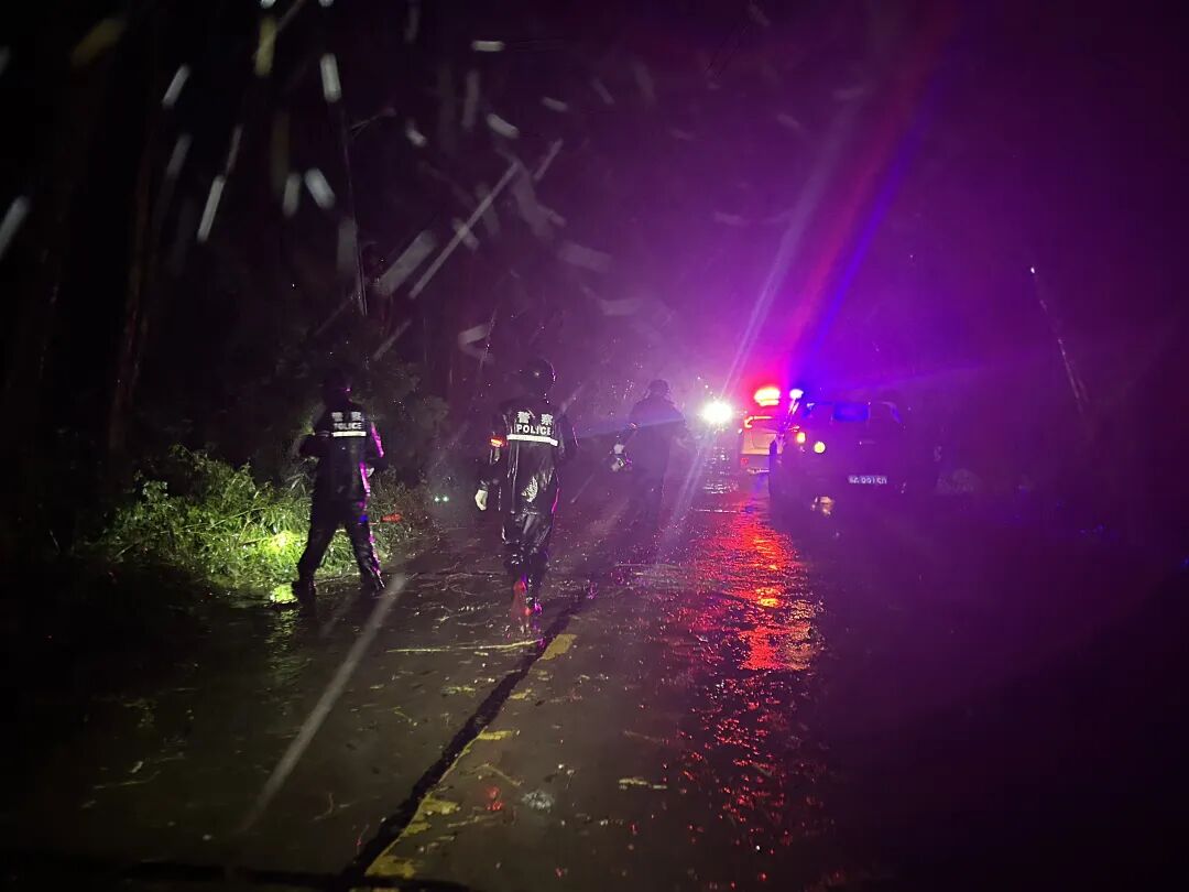 林林副縣長帶隊青年民警突擊隊、機動訓(xùn)練大隊和交管大隊等應(yīng)急力量,趕赴G207、G228等主干道,扶起狂風(fēng)吹倒的中間防護欄,鋸砍斷并移開倒在路間的樹木,支起倒下的廣告牌,在積水深路段樹立警示牌,筑起守護人民生命財產(chǎn)安全防線。