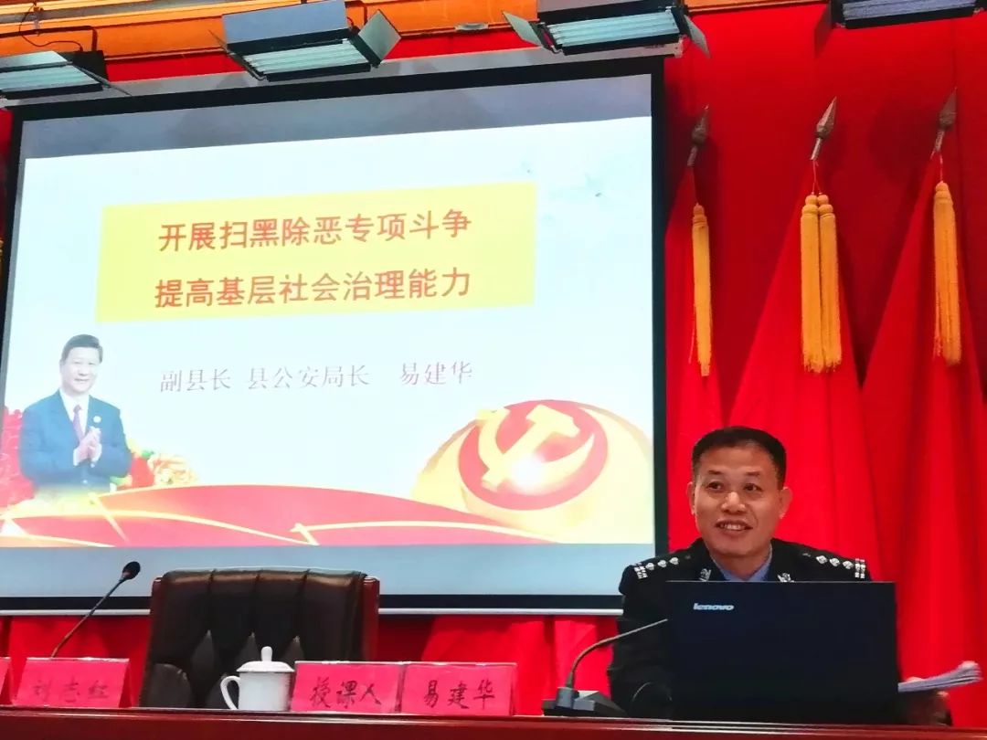 易建華同志作了《開展掃黑除惡專項斗爭 提高基層社會治理能力》的主題授課,重點分析我縣開展掃黑除惡專項斗爭中存在的問題,從開展掃黑除惡專項斗爭的背景、重要意義、基本原則和打擊重點、黑社會性質組織和惡勢力犯罪集團及惡勢力的認定和區(qū)別等四個方面進行了解讀,分析工作成效和存在問題,著重布置今年工作重點和“六個延伸”。